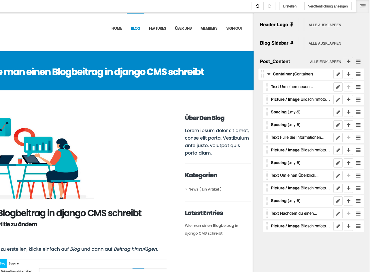 Um einen Überblick über alle Artikel zu erhalten, klicke auf Beitragsübersicht anzeigen. Dort kannst du auch Beiträge löschen, veröffentlichen, nicht veröffentlichen und Kommentare für ausgewählte Beiträge aktivieren.