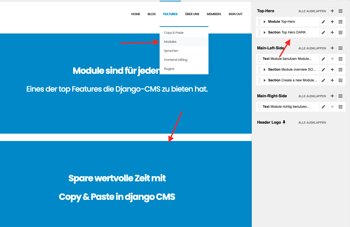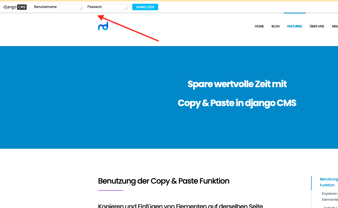 Falls du dich noch nicht eingeloggt hast, logge dich ins django CMS ein