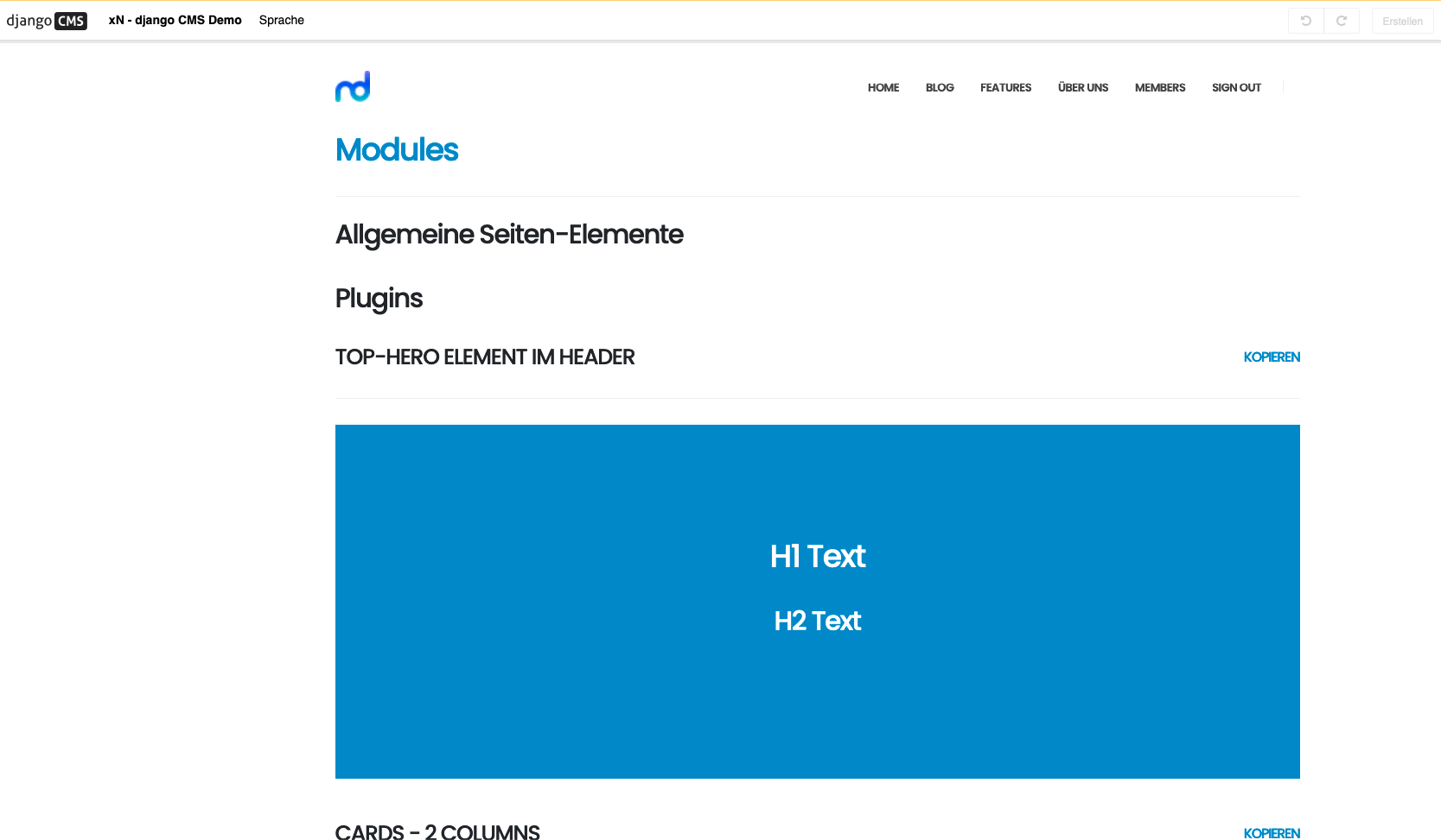 Gehe zu xN - django CMS Demo und klicke auf Modules. Dort findest du alle vorbereiteten Module für diese Demo-Seite. Suche dir das Modul aus wo du brauchst und klicke auf Kopieren (rechts) und füge das Modul an der gewünschten Stelle ein.