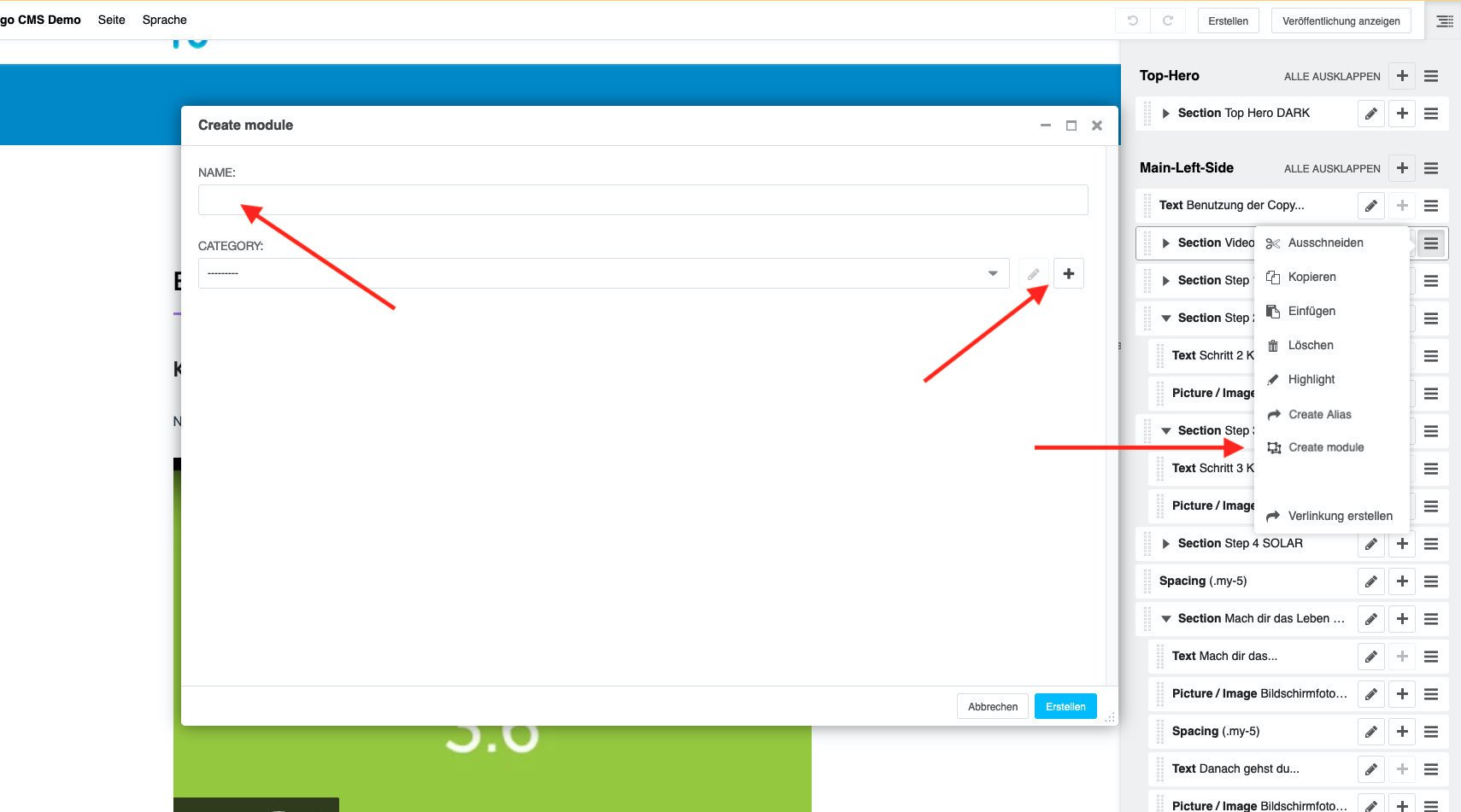 Öffne die Seitenleiste und wähle das Element aus, das du hinzufügen möchtest. Klicke auf Modul erstellen und lege Namen und Kategorie fest. Nachdem du auf "Erstellen" geklickt hast, wird das Modul zum Modul-Repository hinzugefügt.