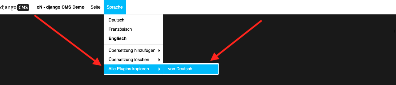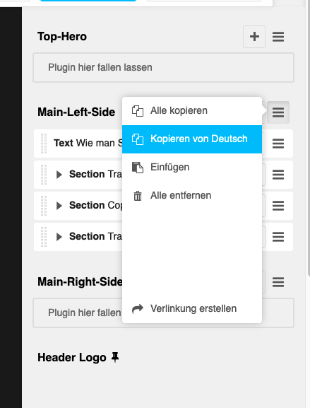 Nehmen wir an, du erstellst eine Website in zwei Sprachen, Deutsch und Englisch. Nachdem du die deutsche Seite erstellt hast, kannst du den gesamten Inhalt einfach auf die englische Seite kopieren. Gehe zu Sprache und klicke auf Alle Plugins kopieren. Dann musst du den Inhalt nur noch übersetzen und einfügen.