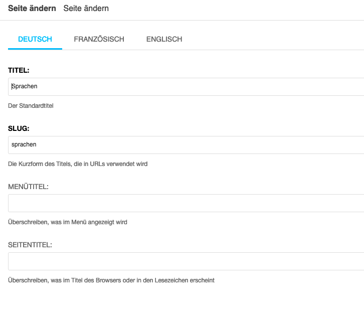 Für jede Seite kann die Sprachversion in Bezug auf Titel, Slug usw. angepasst werden.